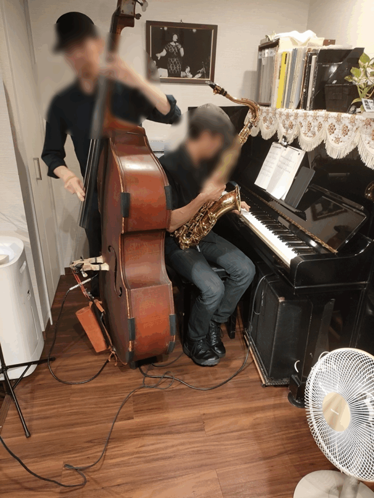 写真は、なかなか見ることが出来ないベースとサックスとピアノのデュオの場面です。