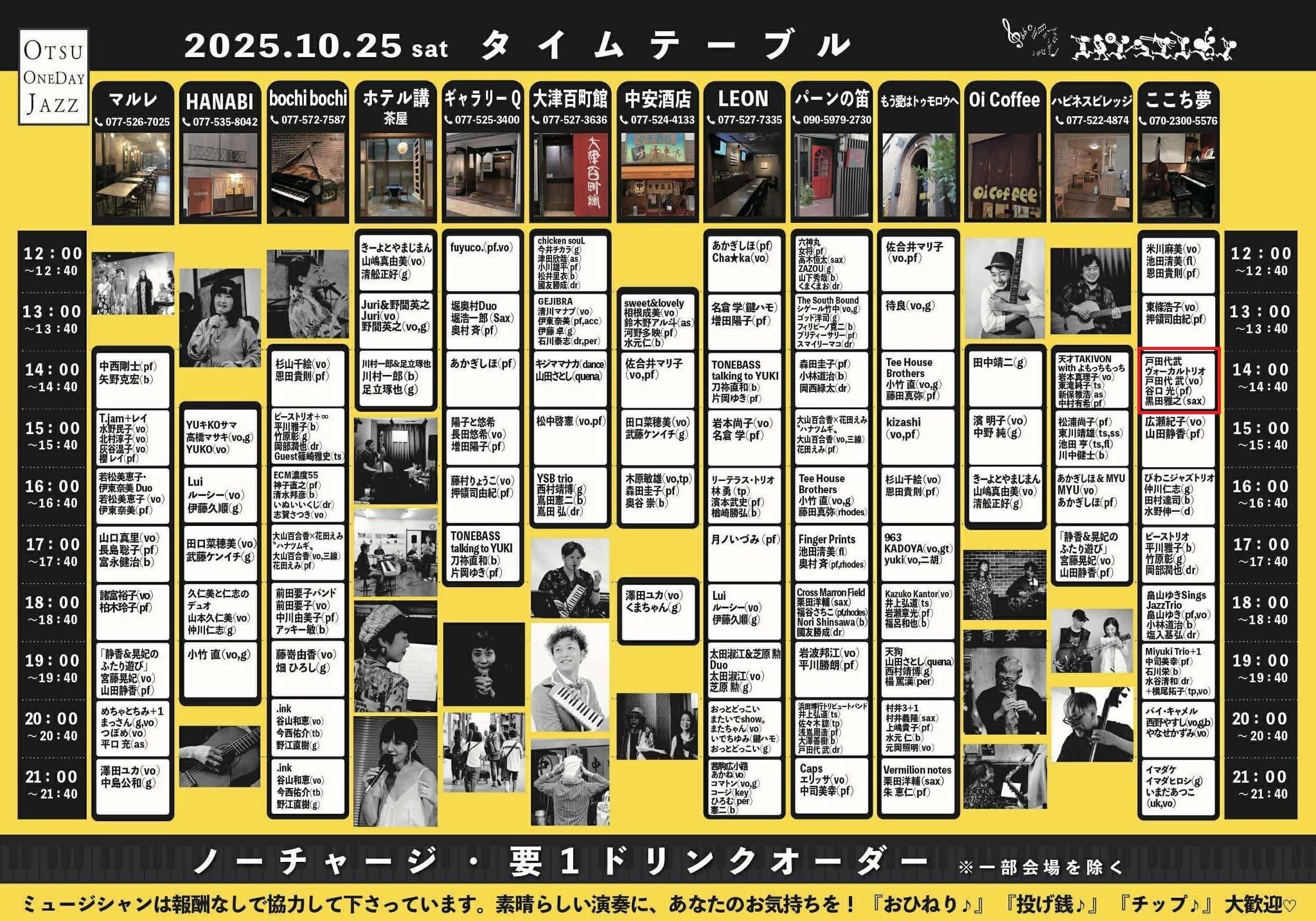 bochi bochi OtsuOnedayJazz ここち夢 ちゃっぴーラボ ギャラリーQ パーンの笛 ブルーノートならまち 三井寺 中安酒店 松江バースデー 琥珀 石山夜市 草津コルトレーン