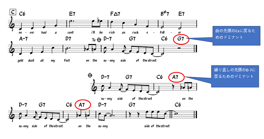 でも、このコードのままでやったら変になるから、繰り返す場合は最後がG7じゃなくてA7にしといたらいいな。