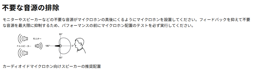 スピーカーに向けるとハウリングが発生するので、これは当然の事かと思いますが、気にして欲しいのは、マイクの指向性が示す範囲です。